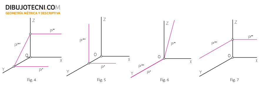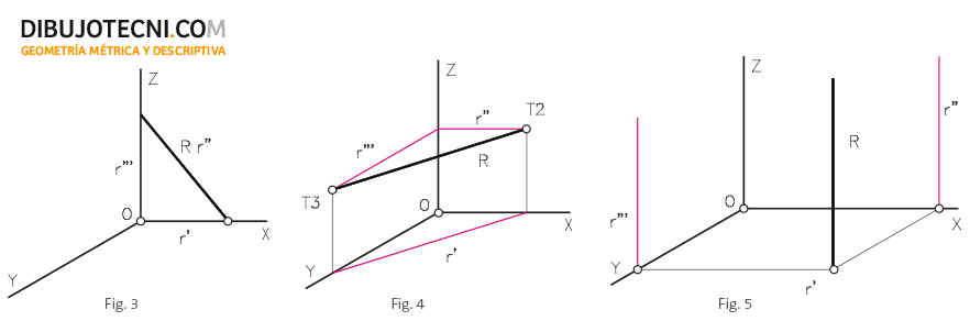 - Recta contenida en un plano de proyección: La proyección principal y una secundaria son coincidentes, el resto están sobre los ejes. Figura 3.