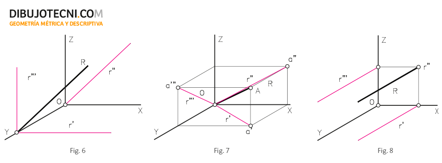 - Recta que pasa por el origen: Las tres trazas de R coinciden en el origen y por tanto pasan por aquí principal y secundarias. Para determinar las proyecciones secundarias de R nos auxiliamos de un punto A de la recta. Figura 7.
